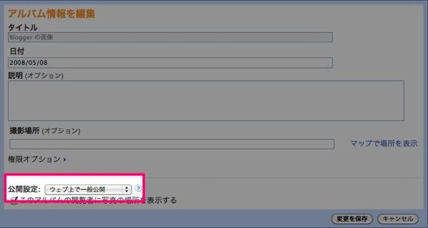 ブログで使用する画像を置くアルバムを一般公開に設定してください。