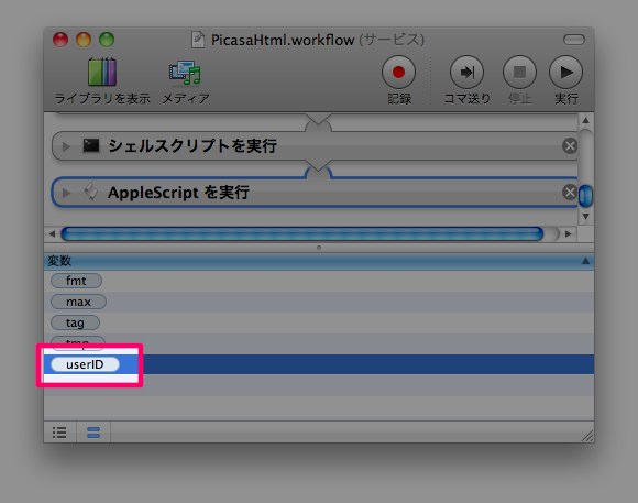 Automator で workflow ファイルを開き、userID という変数に Picasa のユーザID を設定してください。
